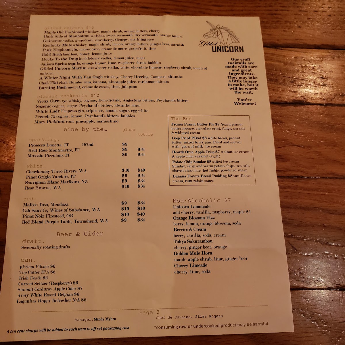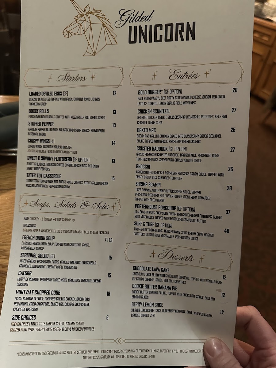 Welcome to Gilded Unicorn, a culinary gem nestled in the heart of Spokane at 110 S Monroe St. This enchanting eatery combines a cozy ambiance with a menu that captivates the senses. Each dish is crafted with passion, from the rich French Onion Soup to the hearty Montvale Chopped Cobb salad. Starters like Tater Tot Casserole and Loaded Deviled Eggs promise to delight your palate before diving into the luscious entrees.